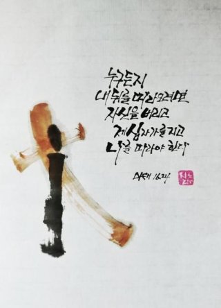 = 제 십자가, 나를 힘들게 하는 가족, 이웃을 끝까지 참아주고 섬기는 것을 말하지 않는다. 그렇다면 주님을 믿지 않는, 그러나 힘들게 하는 가족, 이웃을 참아가며 섬긴 세상 사람들이 주님의 제자가 될 수 있다는 말이 된다. 세상은, 예수님을 적대하며 미워, 죽이기까지 했는데...,