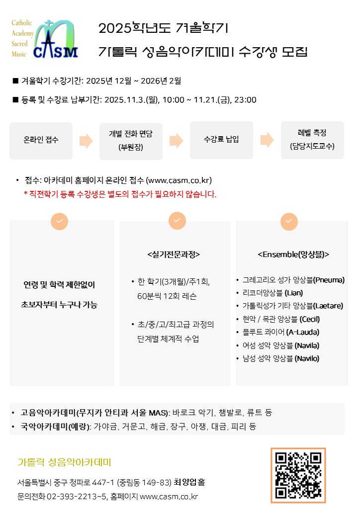 - [가톨릭 성음악아카데미] 2025학년도 겨울학기(실기전문과정, 앙상블) 신규 수강생 모집