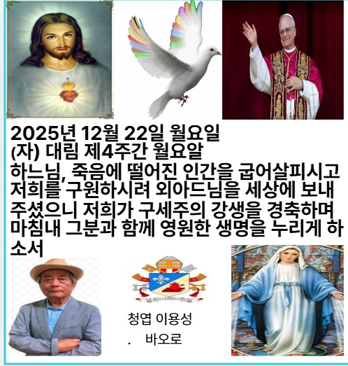 2025년 12월 22일 월요일 (자) 대림 제4주간 월요일 성문들아, 머리를 들어라. 영원한 문들아, 일어서라. 영광의 임금님 들어가신다.