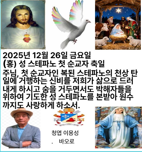 2025년 12월 26일 금요일 (홍) 성 스테파노 첫 순교자 축일 스테파노 성인은 초대 교회의 사도들이 뽑은 부제다. 식탁 봉사를 위한 일곱 봉사자 가운데 하나로 뽑힌 스테파노 성인은 가난한 이들에게 식량을 나누어 주는 일뿐만 아니라, 사도들과 마찬가지로 하느님 말씀을 선포하면서 진리를 증언하는 일도 소홀히 여기지 않았다. 또한 유다인들과 벌인 논쟁에서도 지혜로운 언변으로 그들을 물리쳤다. 유다인들은 스테파노 성인을 도저히 감당할 수 없음을 알고 그가 하느님을 모독하였다는 거짓 소문을 퍼뜨렸다. 결국 그는 돌에 맞아